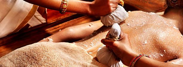 Massage du corps entier aux pochons de riz au lait précédé d’un massage Abhyanga.
